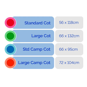 Large Cot: 660mm x 1300mm x 80mm Standard Cot: 550mm x 1170mm x 80mm Large Camp Cot: 720mm x 1040mm x 80mm Standard Camp Cot: 660mm x 940mm x 80mm Side Sleeper Cot: 50mm x 880mm x 80mm